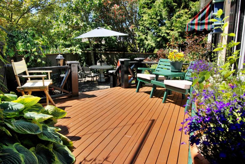 The “Cottage” at Heathergate is reminiscent of an English country cottage retreat, and this one has its own lych gate entrance to a private garden with umbrella table, large south-facing porch deck, and an adjoining herb garden. Let’s just say that more than one gin and tonic has been enjoyed out here in the summer sun! Step through the Cottage’s distinctive door and 825 square feet of spacious comfort greets the visitor. There are two bedrooms, each with a queen-size bed. Both bedrooms are provided with duvets & comfy bed linens.