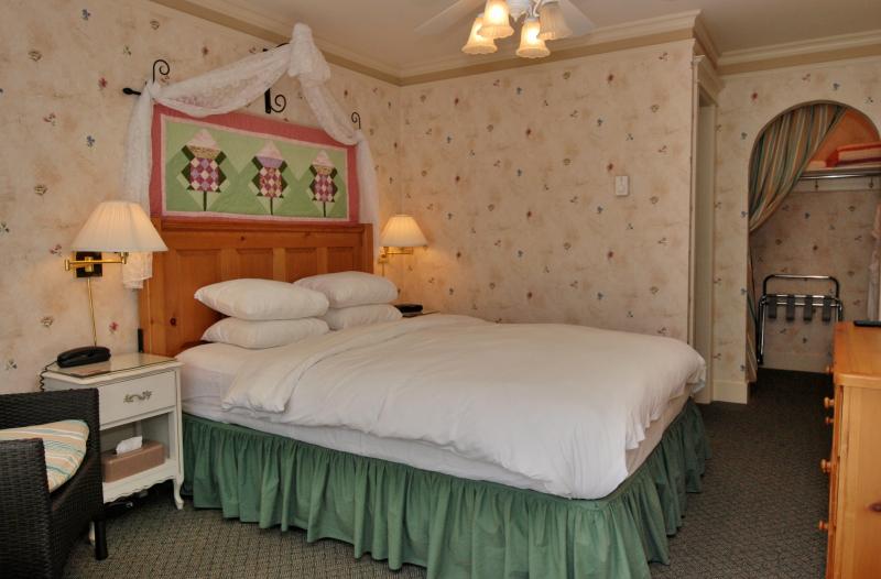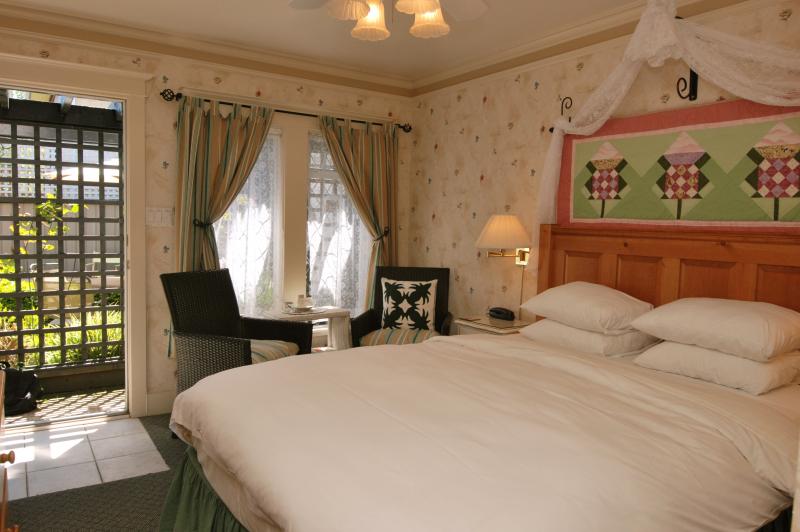Wildflower Garden has its own private external entrance. The delightful full kitchen, affectionately referred to by us as the ‘bistro’, is complimented with an adjoining eating and sitting area and a wall mounted TV. The inviting bedroom offers the comfort of a queen size bed, and a secondary TV. The ensuite bathroom is nicely appointed and includes a glass encased walk-in shower. The charming atmosphere and handsome furnishings contribute to the welcoming feel of this suite.